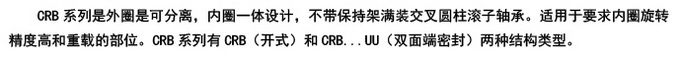 CRB系列是外圈是可分离,内圏一体设计,不带保持架满装交叉圆柱滚子轴承.话用于要求内圏旋转精度高和重载的部位。CRB系列有CRB(开式)和CRB...UU(双面端密封)两种结构类型。